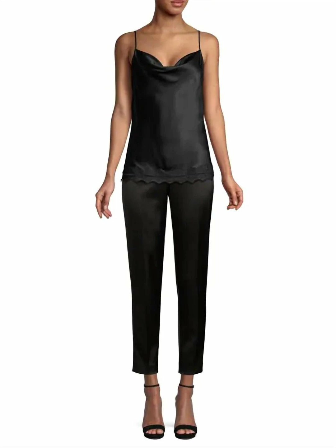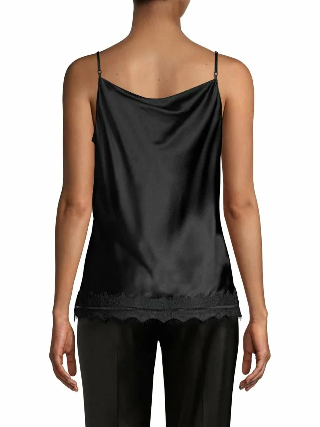 A draped neckline adds a subtle allure to this silk camisole top. Plunging cowlneck. Sleeveless. Pullover style. Adjustable spaghetti straps. Scalloped lace hem. Silk. Dry clean. Imported