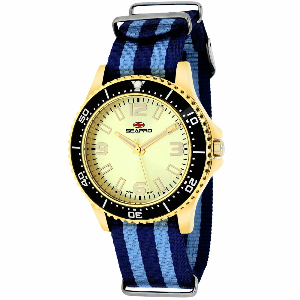 Stainless steel case, Nylon strap, Gold tone dial, Quartz movement, Scratch resistant mineral, Water resistant up to 3 ATM – 30 meters – 100 feet
