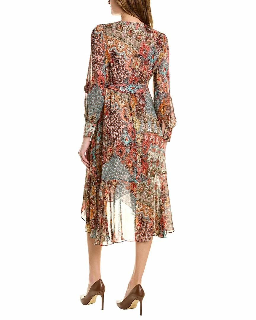 - Paisley Wrap Dress In Red Multicolor With Tie At Waist And Button Cuffs