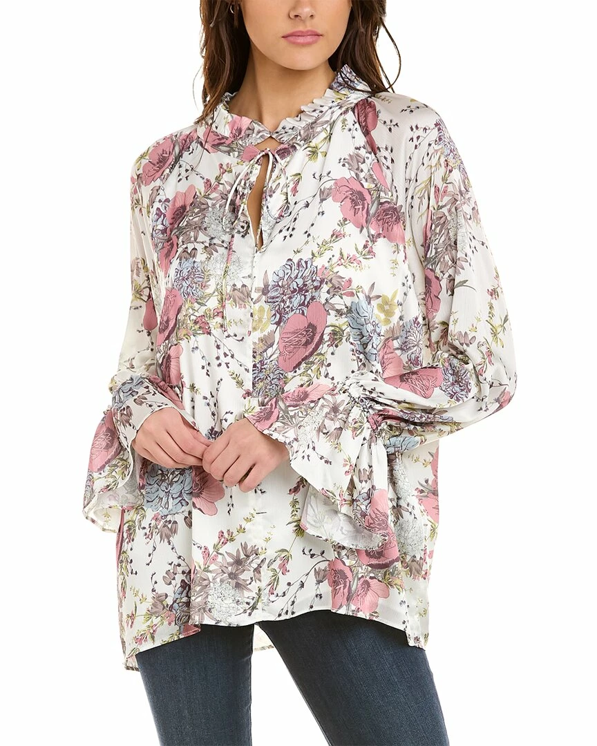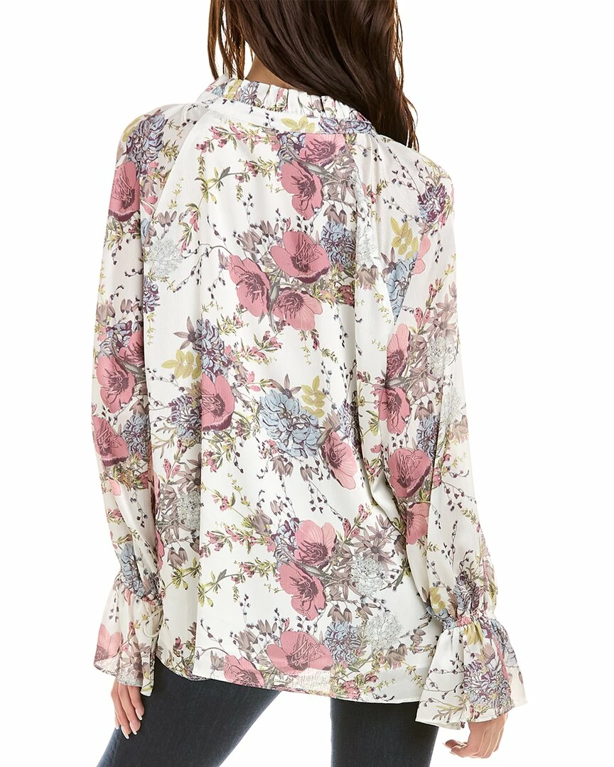 - Ruffle Neck Blouse In White Multicolor With Raglan Sleeves And Tie Flounce Cuffs