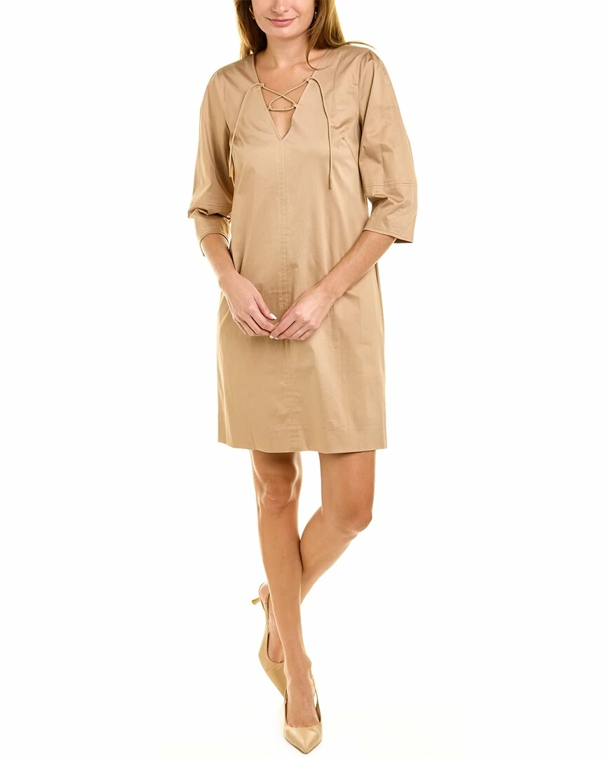 - Tie Up Poplin Dress In Rattan With Elbow-Length Sleeves And Lace-Up Neckline