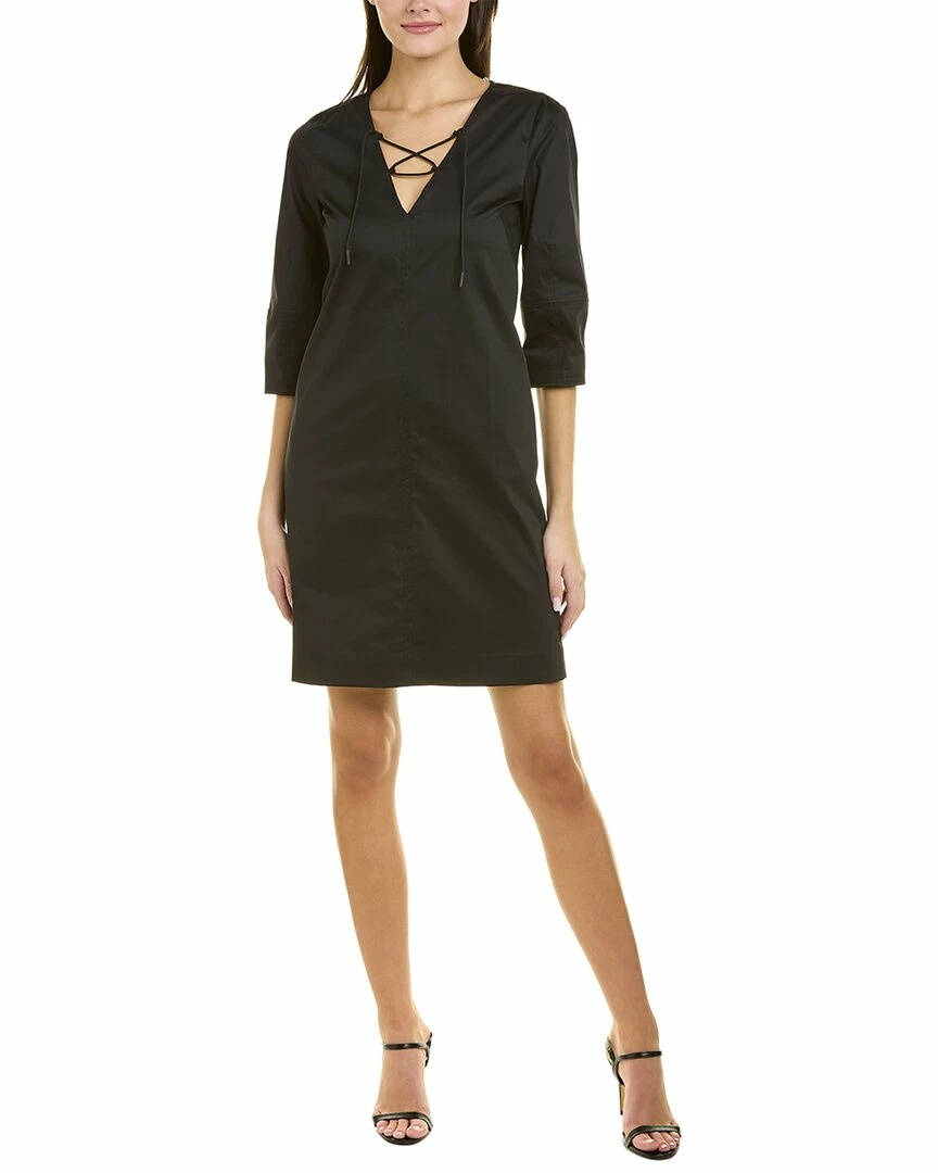 - Tie Up Poplin Shift Dress In Black With 3/4-Length Sleeves And Side Seam Pockets